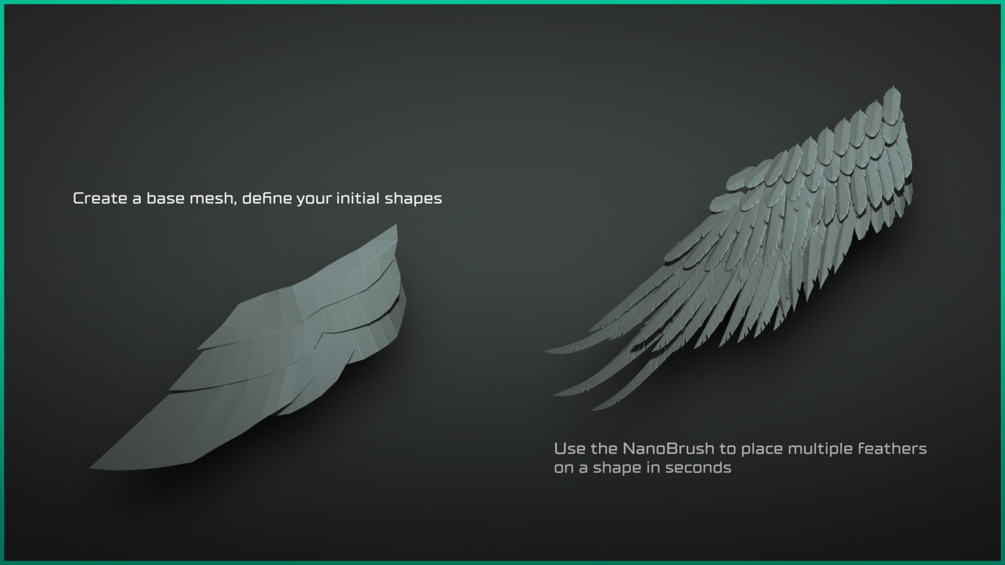 - NanoBrush with the 20 applicable meshes, use it to place multiple feathers on a surface.